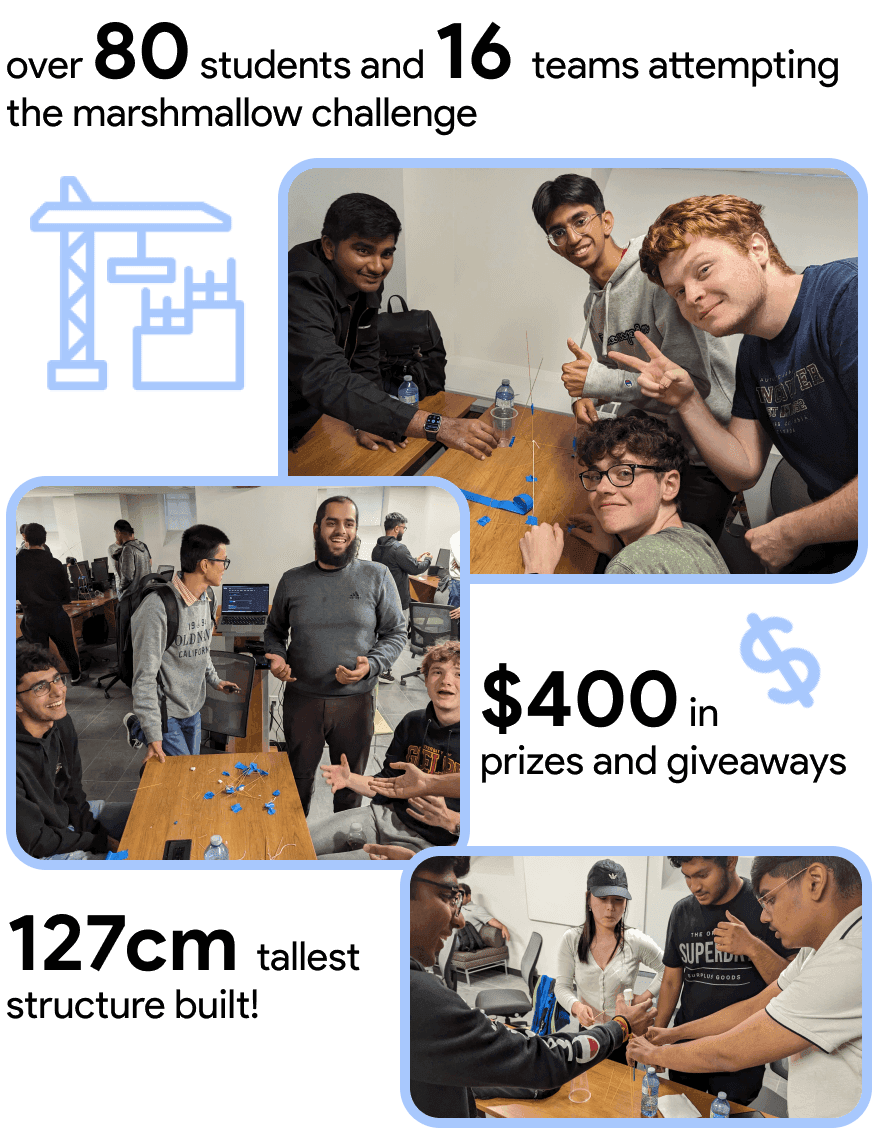 To start things off we held an info session inviting students to learn more about us, connect with their peers, and participate in an icebreaker for a chance to win prizes! The highlight was the marshmallow challenge, a team-building activity where students were tasked with building the tallest structure using only a few supplies. Not only was it a blast, but it sparked creativity and problem-solving skills. From the very beginning, we wanted students to get to know each other and so we were thrilled to see friendships start to form!
